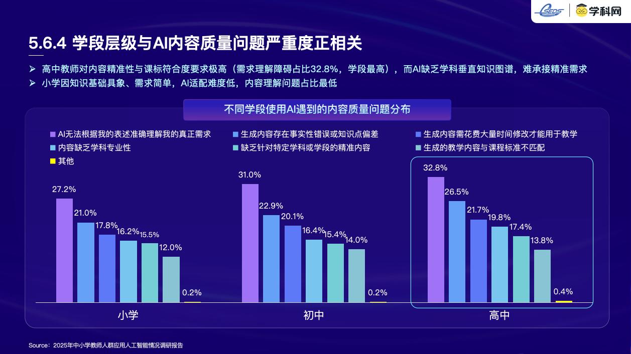 報(bào)告顯示,教師對(duì)于人工智能的應(yīng)用在學(xué)段上差異明顯,小學(xué)教師應(yīng)用場(chǎng)景以基礎(chǔ)教學(xué)資源獲取為主;初中教師的應(yīng)用則逐漸向應(yīng)試需求傾斜,出題組卷類(lèi)工具的使用需求增加;高中教師對(duì)生成內(nèi)容的精準(zhǔn)度要求最為嚴(yán)格,對(duì)內(nèi)容專(zhuān)業(yè)性與準(zhǔn)確性的期待更高。