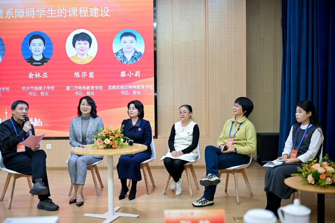 在校長沙龍環節,北京市健翔學校校長王紅霞,青島市晨星實驗學校校長鄭芳,杭州市楊綾子學校校長助理裴春瑩,廈門市特殊教育學校書記、校長陳莎茵,成都市武侯區特殊教育學校校長蔡曉莉五位校長分享了他們在孤獨癥學生課程育人方面的創新實踐。
