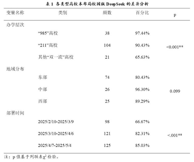 從創(chuàng)新擴(kuò)散的視角來看,DeepSeek在高校層級與地域?qū)用娴耐茝V過程呈現(xiàn)出典型由上而下的擴(kuò)散路徑,部署態(tài)勢表現(xiàn)出顯著的層級化差異。從辦學(xué)層次來看,DeepSeek部署比例隨著高校辦學(xué)層次遞減而逐級降低。如表1所示,截至2025年5月,全國“985”高校中已有38所部署DeepSeek,占比高達(dá)97.44%,“211”高校部署率為90.43%,而在非“211”高校但仍屬于“雙一流”建設(shè)高校中,僅有69.63%的高校完成部署,不同辦學(xué)層次的高校在是否部署DeepSeek上有顯著的統(tǒng)計(jì)學(xué)差異(p<0.001)。這一趨勢表明,辦學(xué)層次較高的高校更易獲得人工智能布局的政策與資源支持,部署節(jié)奏也更為迅速,展現(xiàn)出較強(qiáng)的先行示范效應(yīng)。國家重點(diǎn)建設(shè)的“985”與“211”高校,通常擁有更充裕的科研經(jīng)費(fèi)與更強(qiáng)的技術(shù)基礎(chǔ)設(shè)施,在校內(nèi)具備較為完善的信息化管理體系,更容易對接并落地通用大模型。相較之下,部分普通“雙一流”高校在硬件投入、技術(shù)團(tuán)隊(duì)建設(shè)和跨部門協(xié)同方面仍存在短板,使其在部署大模型時(shí)面臨更多的現(xiàn)實(shí)制約。從高校地域來看,部署率在不同區(qū)域間的總體差異并不顯著,但仍呈現(xiàn)出一定的地域分布規(guī)律。地域差異的成因既包括地區(qū)經(jīng)濟(jì)發(fā)展水平、教育信息化建設(shè)程度等客觀因素,也受到地方政策引導(dǎo)、教育行政管理方式與高校間協(xié)作機(jī)制的影響。中部地區(qū)有較強(qiáng)的區(qū)域協(xié)同傳統(tǒng)與高校聯(lián)盟體系,使得新技術(shù)推廣可以通過以點(diǎn)帶面的模式快速擴(kuò)展。相較之下,東部地區(qū)的部署節(jié)奏反而略顯滯后,可能與高校自主性較高有關(guān)。從部署時(shí)間來看,高校大規(guī)模部署DeepSeek的時(shí)間集中在二月中旬到四月上旬,呈現(xiàn)出迅速增長到逐漸飽和的規(guī)律,“雙一流”高校對DeepSeek的部署時(shí)間上存在顯著的統(tǒng)計(jì)學(xué)差異(p<0.001)。