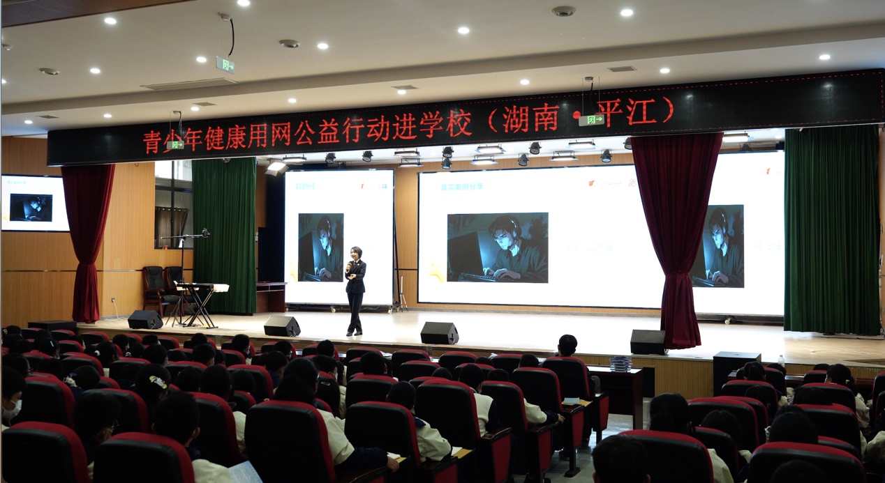 在平江縣啟明中學(xué)活動(dòng)現(xiàn)場(chǎng),她向?qū)W生們做了一個(gè)小調(diào)查:“你們平時(shí)上不上網(wǎng)?你們上網(wǎng)主要做什么?上網(wǎng)過(guò)程中,有無(wú)遇到過(guò)‘網(wǎng)絡(luò)陷阱’?”