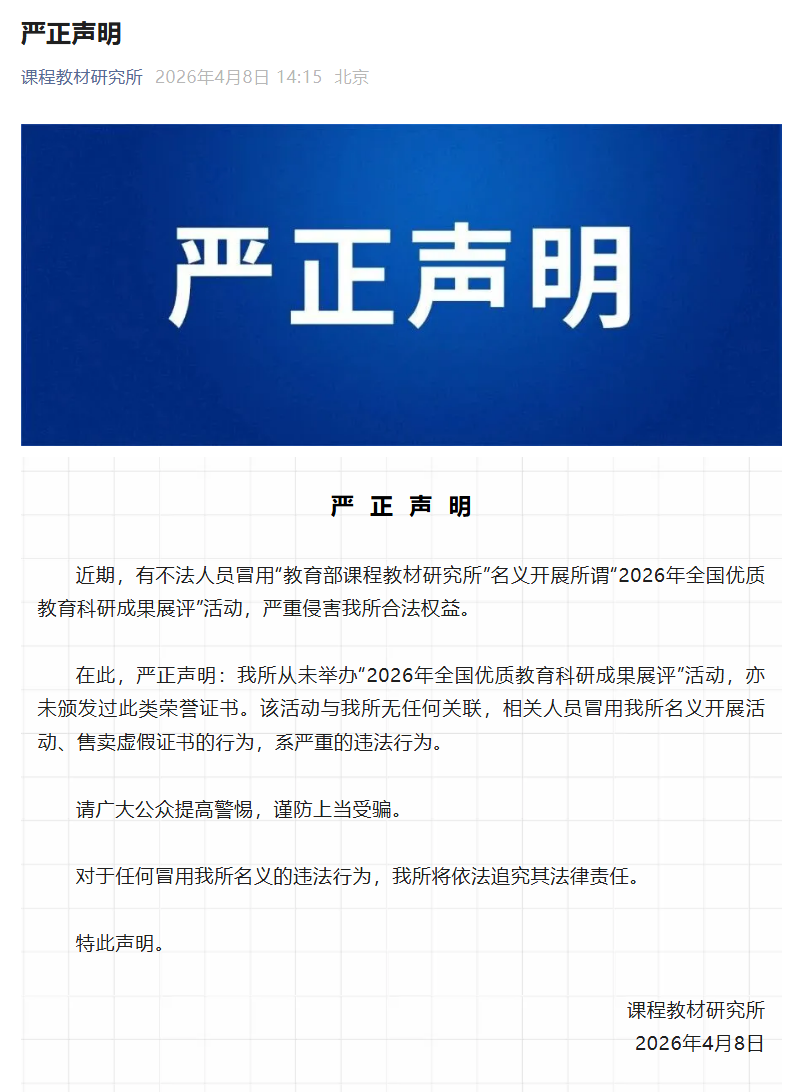 近日,課程教材研究所通過微信公眾號(hào)發(fā)布嚴(yán)正聲明,表示:近期,有不法人員冒用“教育部課程教材研究所”名義開展所謂“2026年全國優(yōu)質(zhì)教育科研成果展評(píng)”活動(dòng),嚴(yán)重侵害我所合法權(quán)益。我所從未舉辦“2026年全國優(yōu)質(zhì)教育科研成果展評(píng)”活動(dòng),亦未頒發(fā)過此類榮譽(yù)證書。該活動(dòng)與我所無任何關(guān)聯(lián),相關(guān)人員冒用我所名義開展活動(dòng)、售賣虛假證書的行為,系嚴(yán)重的違法行為。請(qǐng)廣大公眾提高警惕,謹(jǐn)防上當(dāng)受騙。對(duì)于任何冒用我所名義的違法行為,我所將依法追究其法律責(zé)任。特此聲明。