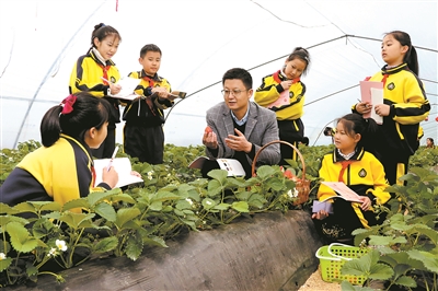 近日,山東省棗莊市市中區文化路小學結合校本教材《食育課程》內容,組織學生走進田間參加社會實踐活動,體驗農耕文化,讓學生在寓教于樂的研學活動中掌握食育相關知識,從小養成勤儉節約和愛勞動的好習慣。圖為教師向學生講解草莓的營養價值。吉喆 王翔 攝