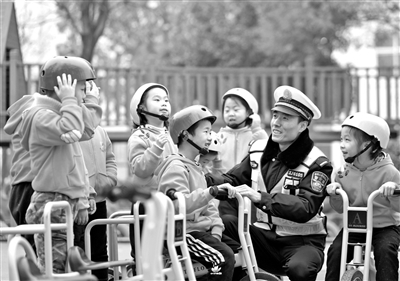 日前,在全國交通安全日到來之際,河北省邢臺市內(nèi)丘縣公安交通警察大隊民警走進該縣第三幼兒園,開展“交通安全伴我行”主題宣教活動,向教師和孩子們普及道路交通安全知識,增強他們安全文明出行的意識。圖為交警叔叔給孩子們講安全常識。