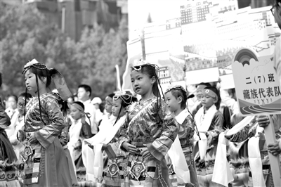 體育活動與民族文化可以碰撞出怎樣的火花?日前,浙江省江山市城南小學在第六屆體育節開幕式上,47個班級圍繞“各異的民族風采”主題亮相,學生們在體育活動中感受不同民族文化,為體育活動增添別樣色彩。圖為浙江省江山市城南小學二(7)中隊展示藏民族文化風采。