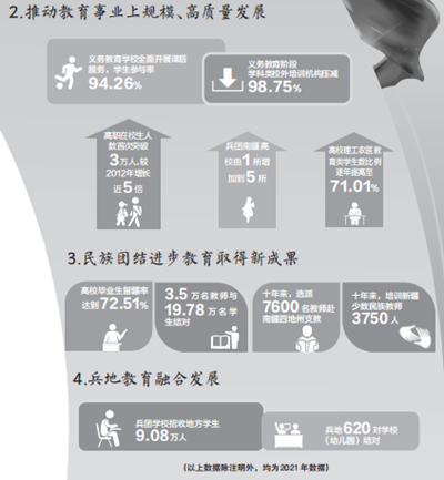 始終把人民群眾對優質教育的期盼作為奮斗目標。黨的十八大以來,兵團教育堅持人民主體地位,以人民為中心發展教育,不斷提高教育質量,促進教育事業發展更多更公平惠及全體人民。兵團持續推進學前教育普及普惠安全優質發展,實施了三期學前教育三年行動計劃,推進“安吉游戲”試點工作,克服“小學化”傾向。兵團深化義務教育教學改革,全面提升義務教育質量,創新辦學模式,推進城鄉義務教育一體化發展。2018年11月,兵團全域實現義務教育基本均衡,成為西部地區第二個整體通過國家評估認定的省級單位,比2011年教育部與兵團簽訂的備忘錄提前了兩年,義務教育由基本均衡向優質均衡發展邁出堅實步伐。兵團啟動新一輪高中課改,做實普通高中區域聯盟,積極探索普通高中特色學校建設,打造一批特色品牌學校。兵團推進構建現代職業教育體系,加快職業院校標準化建設,開展高職教育與本科教育聯合培養應用型人才試點;啟動兵團高水平高等職業院校和專業建設、兵團優質中等職業學校和品牌專業(群)建設;優化專業布局,其中高職院校70%以上專業為戰略性新興產業和現代服務業相關專業,連續3年超額完成高職擴招任務。2021年,兵團高職院校在校生人數首次突破3萬,較2012年增長近5倍。兵團推進高等教育內涵式發展,調整優化學科專業結構,理工農醫教育類學生數比例到2021年提高至71.01%;實施本科教育振興行動計劃,持續加強“新工科、新農科、新醫科、新文科”建設;全面落實“部兵合建”石河子大學和“省部共建”塔里木大學各項工作,一流學科建設邁出堅實步伐。兵團全面打贏教育脫貧攻堅戰,建檔立卡貧困家庭義務教育階段學生失學輟學動態清零,面向10萬余名職工、群眾開展職業技能培訓,探索了阻斷貧困代際傳遞的有效途徑。兵團教育建立健全從學前教育到高等教育的學生資助體系,確保每個孩子不因家庭經濟困難失學輟學。