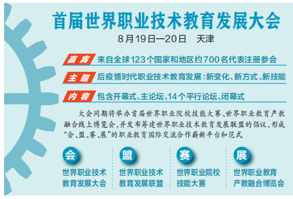 “會”即世界職業技術教育發展大會。8月19日下午將舉行大會開幕式和主論壇,來自18個國家的教育部長或駐華大使、部分國際組織、行業組織、知名企業和職業院校代表將發表演講。8月20日全天,舉辦14場平行論壇,250多名專家學者將圍繞“數字賦能、轉型升級”“綠色技能、持續發展”“命運與共、合作共贏”“普職協調、終身學習”等議題發表演講。之后將舉行閉幕式,發布籌建世界職業技術教育發展聯盟的倡議、發布《天津倡議》并總結大會成果。