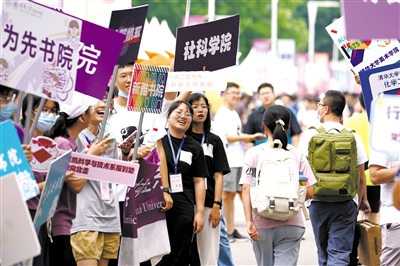8月17日,在清華大學迎新點,學生舉著院系牌迎接新生入學。當日,清華大學3700余名2022級本科新生入學報到,開啟大學生活。據介紹,2022年清華大學錄取本科新生包括內地學生3400余人、港澳臺學生80余人、國際學生約200人。新華社記者 鞠煥宗 攝