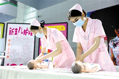 參賽選手在進行新生兒護理演示。本報記者 陳欣然 攝