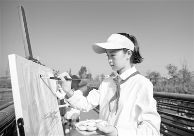 近日,江蘇海安高新區實驗小學學生在尾水濕地公園用畫筆描繪家鄉碧水藍天的生態美景。