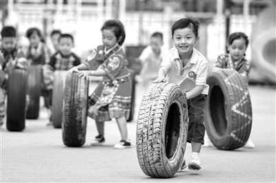 8月31日,浙江省湖州市長興縣畫溪街道包橋中心幼兒園的孩子們一起趣玩花樣滾輪胎。當日,該園組織孩子們歡跳竹竿舞、趣味投壺等體育運動,體驗多種趣味運動。譚云俸 攝