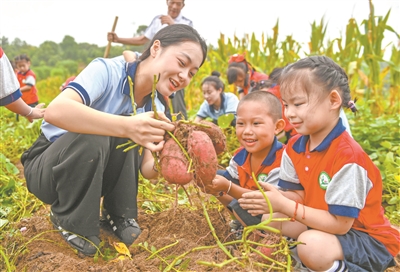 日前,浙江省湖州市長興縣泗安鎮(zhèn)二界嶺村現(xiàn)代農(nóng)業(yè)產(chǎn)業(yè)園區(qū),泗安鎮(zhèn)二界嶺中心幼兒園的孩子們在采收番薯。該園將幼兒勞動教育納入“開學第一課”,組織教師和孩子們參與農(nóng)耕過程,學習勞動技能,在實踐中體驗勞動的樂趣。譚云俸 攝