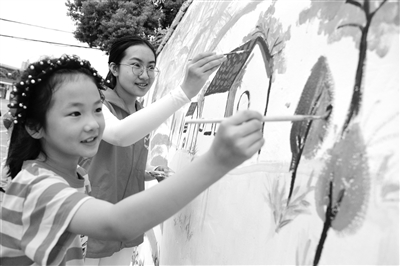 近日,在江蘇省鎮江市潤州區秀山村,江蘇大學志愿者帶著小朋友一起在墻上描繪鄉村振興、歡樂生活、綠色生態等一幅幅“美麗鄉村”主題畫,美化村莊環境,傳遞文明和諧正能量。