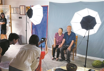 兩間平房、兩塊幕布、幾把椅子,師生們就地取材,在村委會搭起一間簡易攝影棚。拍攝時,大多數村民面對鏡頭會選擇懷抱一筐紅棗、甜杏,或手握鋤頭、鐵耙。“這正是我們想定格的屬于勞動者的美麗。”學生梁沁深有感觸地說。