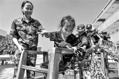 近日,在浙江省湖州市長興縣小浦鎮中心幼兒園,駐地部隊官兵與孩子們一起,開展“勇奪瀘定橋”“穿越封鎖線”等“重走長征路”系列趣味拓展活動,并聆聽革命故事和英雄故事,弘揚愛國主義精神,傳承紅色基因。譚云俸 攝