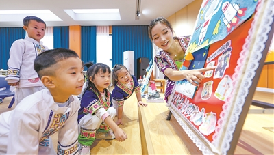 10月9日,在貴州省銅仁市玉屏侗族自治縣實(shí)驗(yàn)幼兒園民族團(tuán)結(jié)小課堂上,老師給小朋友們講民族團(tuán)結(jié)小故事。近年來,該縣在中小學(xué)、幼兒園中開設(shè)民族團(tuán)結(jié)小課堂,培養(yǎng)小朋友從小愛黨愛國愛家鄉(xiāng)的情感。胡攀學(xué) 攝