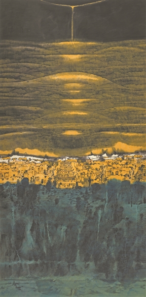 作品通過圖像語言確立山水畫中的內(nèi)部支撐關(guān)系,引向畫面中心最具代表性的建筑圖像,如敦煌唐代第96窟的九層窟檐,神形皆有,巍峨壯觀,是《永遠的敦煌》畫作中的標志性建筑,周圍掩映的窟群大小各異,疏密有致,巧施變化于均衡關(guān)系中。將千年莫高窟植進宇宙洪荒的黑黃背景中,大面積色塊渲染的空間傾瀉而下,置身枝葉縱橫的茂林叢中遠眺,高低錯落,一覽無余,仿佛靈光照映禪意神秘的蒼茫大地。物理學(xué)家楊振寧稱贊盧禹舜的鴻篇巨作參透宇宙奧妙,莊子“天地有大美而不言”,盧禹舜的“敦煌”亦是如此,內(nèi)心不懈追求天地大美的審美意趣,充滿對傳統(tǒng)文化精神的崇高敬仰。大漠荒原中的奇觀萬象,如同穿越時空般躍然紙上,成為傳遞心象的水墨圖景,展開曠野宏大的視覺空間,傳達山水嶄新的意境氣息,山水元素被賦予當代文化象征的精神意蘊和文化基因。天地萬象、乾坤大義,時空共融于淋漓氤氳的繪畫語言,畫盡北方山水的蒼茫之意與濃潤之感,層層相疊的自然山水如超越空間的循環(huán)往復(fù),從地面一直延伸至遠處天際延綿不斷,構(gòu)成宇宙萬物的天地精華。水墨暈染,渾厚華滋,精妙渲染酣暢雄渾的外部世界,曠達無垠,清凈無塵。經(jīng)過筆墨、虛實、意境烘托超越自然空間的神韻、品格、意趣的悠遠意境,彌漫山色朦朧隱現(xiàn),表達光影神秘虛幻般的似真似幻,儼然擇一處世外桃源,觀照心靈的樂土,縈繞在觀者生命里巍然矗立的盛世之光。