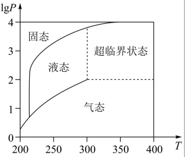 在北京冬奧會上,國家速滑館“冰絲帶”使用高效環保的二氧化碳跨臨界直冷制冰技術,為實現綠色冬奧作出了貢獻。如圖描述了一定條件下二氧化碳所處的狀態與T和lgP的關系,其中T表示溫度,單位是K;P表示壓強,單位是bar。下列結論中正確的是()