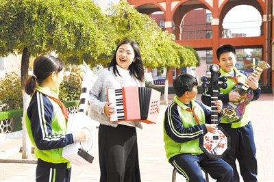 10月31日是世界勤儉日,河北省唐山市豐潤區團結路小學開展“小小巧手變廢為寶”主題實踐活動。圖為教師和學生一起展示用廢舊物品制成的“樂器”。朱大勇 攝
