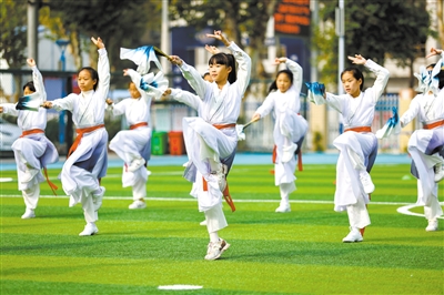 日前,湖北省襄陽市大慶路小學教育集團的學生在社團活動時間進行折扇操健身活動。襄陽市樊城區通過深入推進體育教學改革,廣泛開展體育社團活動,建立體育競賽機制,助力“雙減”政策落地落實,增強學生體質,努力實現“讓運動成為習慣”的教育愿景。 付曉方 攝