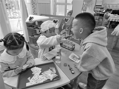 活動過程:教師和孩子們共同討論“為什么我們班今天做核酸很慢”的問題。有的孩子說:“卡片太小,很容易丟。”有的孩子說:“因為老師要一個一個地發放,就很慢。”對此,我們想出了改進措施。第一,教師將健康碼重新打印出來,調整好大小并進行塑封。當我們將健康碼再次發給孩子們的時候,有的孩子說:“老師,我覺得這個靜態碼不好看。”怎么辦呢?有的孩子提議:“我們可以在空白的地方畫一些小裝飾呀!”這樣的想法得到了很多孩子的支持,于是每個人都給自己的靜態碼畫上了喜歡的邊框,每個人的靜態碼都變得獨一無二了。第二,靜態碼如何管理呢?我們利用一個小口袋,每個人在小口袋上做了自己的標記,然后將靜態碼放進小口袋,當需要做核酸的時候,可以自己去取健康碼。第三,健康碼不僅能用于日常做核酸,在一次區域游戲時,我驚喜地發現孩子們將健康碼用在了游戲中,嘗試在“小醫院”開展做核酸的游戲,每個來到“小醫院”的孩子,都會自主取下健康碼,“小醫生”掃碼、做核酸,游戲變得更加真實有趣。