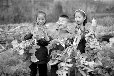浙江省金華市武義縣壺山小學(xué)學(xué)生化身“小菜農(nóng)”體驗(yàn)蔬菜采摘。在菜地,學(xué)生攥著一把葉子一個(gè)個(gè)拔起蘿卜,體會(huì)勞動(dòng)人民的艱辛與豐收的樂(lè)趣。 徐曉奕 攝