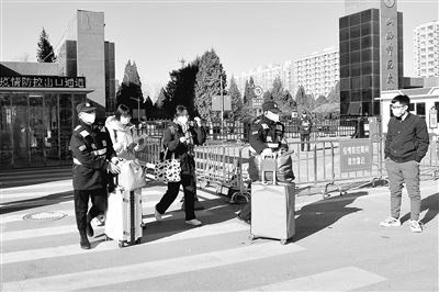 ?12月1日,安保人員幫助學(xué)生安全離校。