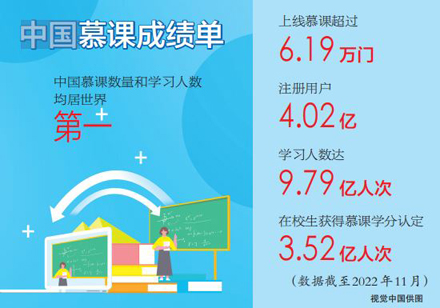 一組數字見證著中國慕課的蝶變:截至2022年11月,上線慕課超過6.19萬門,注冊用戶4.02億,學習人數達9.79億人次,在校生獲得慕課學分認定3.52億人次,中國慕課數量和學習人數均居世界第一,并保持快速增長的態勢。