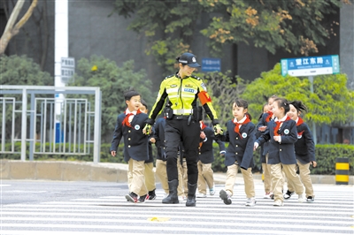 12月8日,安徽省合肥市包河區衛崗小學附近,交警正在開展暖心“護學崗”工作。進入冬季,低溫惡劣天氣增多,道路交通環境復雜。近期,合肥公安交警部門精心組織,安排警力在各學校門口及周邊主要路口、路段執勤,進行精準護學,全力維護各學校門前的道路交通秩序,切實保障轄區中小學生上下學期間道路交通安全。汪宜勝 攝