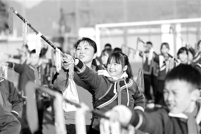 12月13日,貴州省黔東南苗族侗族自治州岑鞏縣羊橋小學教師在指導學生練習省級非遺項目“金錢棍”。近年來,岑鞏縣十分重視非物質文化遺產的傳承和保護工作,把省級非遺項目“金錢棍”納入全縣各中小學的大課間和社團活動,通過定期邀請非遺傳承人進行指導,讓學生感受傳統非遺技藝的魅力,傳承非遺文化。