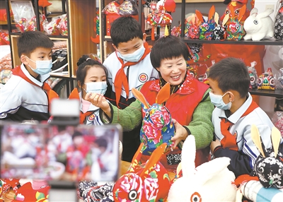 12月21日,山東省臨沂市沂南縣非遺傳承人鄭光云教小學生縫制生肖兔玩具。杜昱葆 攝