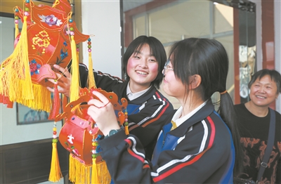 1月3日,正在對學生宮燈作品進行點評的刺繡藝術師、甘肅省張掖市非遺保護項目王氏宮燈掛件制作技藝傳承人王秀娥(右一)和學生在一起。張掖市民樂縣職業教育中心學校組織非遺傳承人通過學校社團、課外興趣小組等,針對不同學齡段的學生開展常態化授課,傳承非遺保護項目,弘揚中華優秀傳統文化。本報記者 張學軍 攝