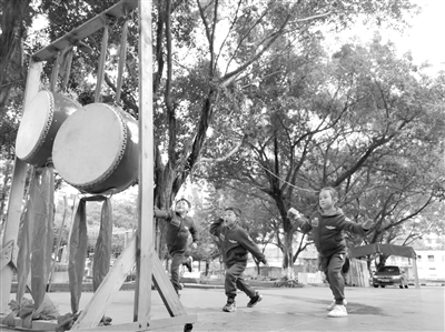 智慧源起:大鼓是中華民族的傳統樂器,承載著源遠流長的歷史文化和傳統習俗。在節慶活動中敲響大鼓,寓示著喜慶與吉祥。新春佳節到來之際,幼兒園里添置了幾面大鼓,孩子們每次經過,總是忍不住要去摸一摸、敲一敲。為了順應孩子們的興趣,支持他們感受中華民族傳統樂器的魅力,體驗新春佳節歡樂祥和的喜慶氛圍,教師引導孩子們討論:“你想怎么和大鼓做游戲?”受游園活動“盲人摸象”的啟發,孩子們提議將大鼓懸掛起來玩,還結合大鼓“敲擊即響”的特點,與教師合作制作了有趣的“新春吉祥鼓”。