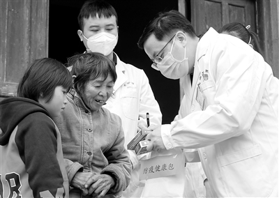1月10日,在湖南省郴州市安仁縣渡口鄉長灘村,來自南華大學第一臨床學院的志愿者給當地村民送上健康包。