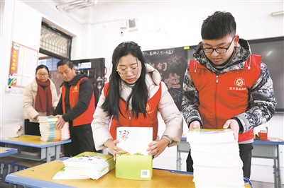 1月30日,在河南省寶豐縣山河路小學,教師在清點教材。新學期開學臨近,各地書店、學校積極做好教材和教輔資料的清點、搬運、分發(fā)等工作,為開學做好準備。何五昌 攝(新華社發(fā))
