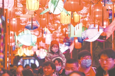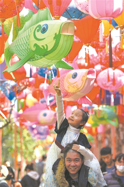 元宵佳節(jié)到來之際,江蘇省南京市老門東歷史文化街區(qū)熱鬧非凡,處處張燈結(jié)彩,節(jié)日氛圍濃厚。圖為孩子和家長共賞花燈。方東旭 攝