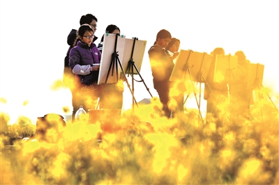 2月21日,一群學生在江西省樟樹市永泰鎮官湖村油菜花海中寫生。隨著天氣回暖,當地油菜花競相綻放,吸引了眾多學生前來觀賞、寫生。 新華社發(周亮 攝)