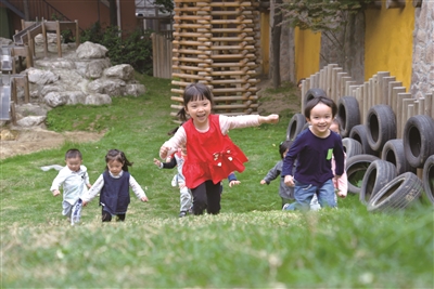 沿著“游戲一條街”往前,再左轉,一棵高聳的銀杏樹下,是一片紅沙地操場,孩子們或三五成群踢足球,或聚在一起玩泥巴,玩得不亦樂乎。對面是游戲區,山坡、樹屋、木橋、流水……掩映在花木之間,宛如童話世界。孩子們歡聲笑語,就像穿梭其中的小精靈。