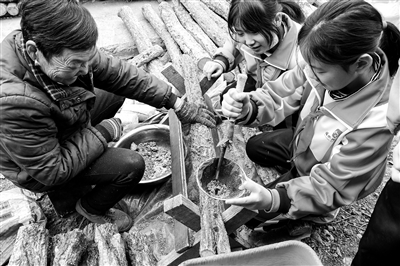 近日,在四川省巴中市通江縣諾水河鎮臨江村通江段木銀耳非遺體驗基地,諾水河鎮中心小學學生在非遺傳承人指導下學習段木銀耳栽植技藝。程聰 攝