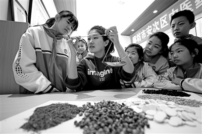 三月二十四日,河北省廊坊市第五小學(xué)教師教學(xué)生如何為藥材稱重。新華社發(fā)