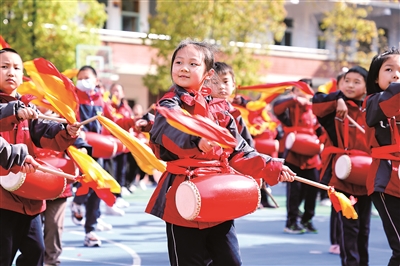 3月30日,湖北省襄陽市萬戶小學(xué)學(xué)生在課間學(xué)打腰鼓。該校為豐富校園文化生活,將腰鼓作為特色健身項目引入學(xué)校,每天利用大課間教學(xué)生練習(xí),在健身的同時傳承傳統(tǒng)文化。付曉方 攝