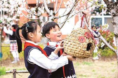 ②3月30日,江蘇省海安經(jīng)濟開發(fā)區(qū)實驗小學(xué)開展“我給小鳥安個家”愛鳥護鳥主題活動,孩子們制作出各種鳥窩,在校園里為小鳥安家。翟慧勇 攝