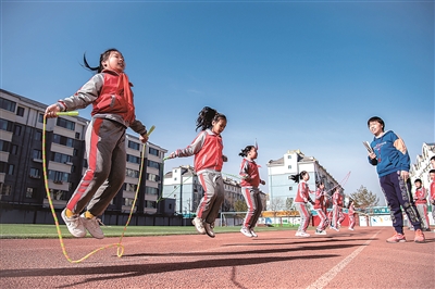 ④3月28日,內(nèi)蒙古自治區(qū)呼和浩特市玉泉區(qū)通順街小學(xué)學(xué)生在春光明媚的校園里進行跳繩項目測試。丁根厚 攝