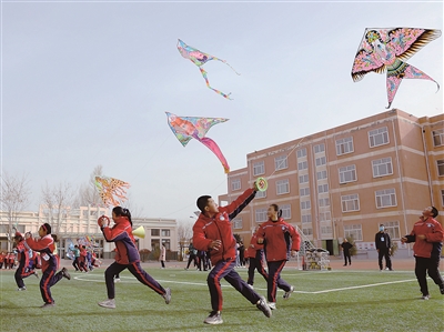 ③3月15日,甘肅省張掖市臨澤縣蓼泉鎮(zhèn)中心小學(xué)開展放風(fēng)箏活動,學(xué)生們紛紛在校園操場上放飛自己親手制作的風(fēng)箏。賈斌 攝