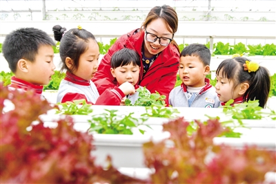 4月3日,在位于浙江省湖州市長興縣泗安鎮的浙江大學農業科技園,泗安鎮中心幼兒園教師帶領孩子們了解無土栽培蔬菜。近日,當地組織開展了農耕研學活動,讓孩子親近大自然,增長自然科學知識,感受農耕趣事。