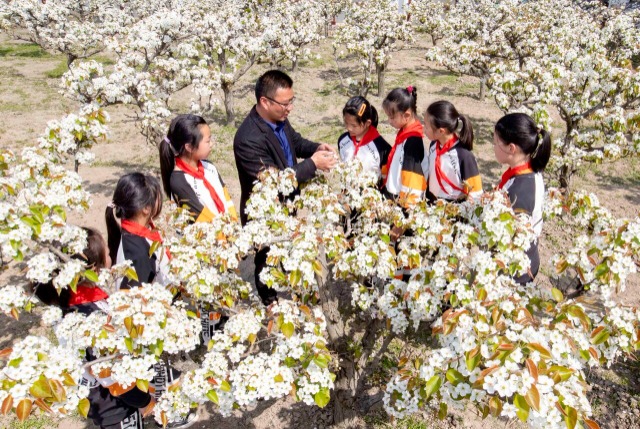 近日,在江蘇省海安市城東鎮延壽小學梨園內,農技人員為學生講解疏花技術。近年來,江蘇省海安市城東鎮延壽小學高度重視勞動教育,通過在教學樓后側栽種梨樹,定期組織學生除草、施肥、剪枝、疏花(果)等勞動實踐活動,讓學生在勞動體驗中學農事、提升勞動素養,體驗勞動之美,享受勞動之樂。向中林 攝