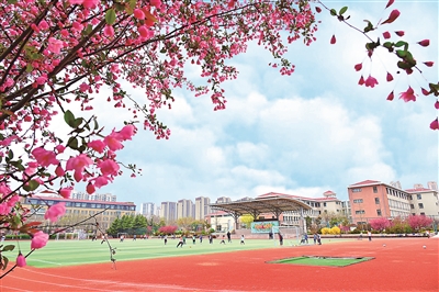近日,在山東省青島博文小學,春的氣息悄然灑滿校園的每個角落,孩子們在操場的春色中奔跑、歡笑、成長。 楊偉 攝