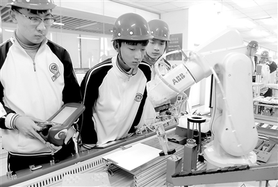 上圖:工業機器人技術應用專業學生正在操作機器人手臂進行物料搬運和碼垛工作。這項技能實操是全國職業院校技能大賽中職組“機器人技術應用賽項”的核心內容,該校學生曾獲此項“國賽”兩金一銀。本報記者 孫軍 攝