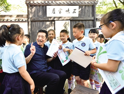 記者在金近小學看到,每天清晨和傍晚,孩子們沿著校園圍墻進入學校。圍墻設計成52個板塊,師生一起創作圍墻畫,推介中外經典書籍。校內3個大草坪布置成3個露天書屋,每逢課間都活躍著閱讀的身影。“金近童話園”里,師生用植物栽種出10個童話造型,下方安插一塊導讀牌,學生可以看造型、找故事、讀故事。還有教學樓里的墻上書吧、閱讀樓角,有趣可感的閱讀元素潤物無聲。
