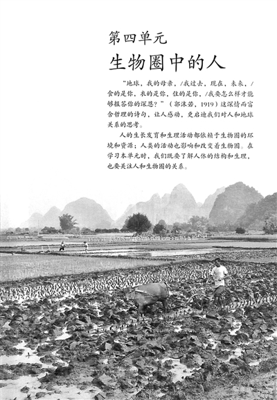 除了這些專門主題的介紹,教材在其他單元或主題中,有的地方也融入了生物與環境、人與自然的關系相關內容。例如,初中生物學在“生物圈中的人”的單元頁,就以人與生物圈的關系,引入本單元的學習。