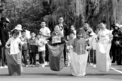 5月6日,在山東省青島市城陽區第二實驗小學,孩子們參與“袋鼠跳跳跳”項目比賽。當日,該校開展了“‘躍’運動‘悅’成長”春季親子趣味運動會,孩子們和家長通過參加袋鼠跳跳跳、瘋狂毛毛蟲、雙人夾球跑、三人持桿合作往返跑等趣味運動,既體驗運動的快樂又增進親子交流。